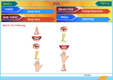 Initials : 11TOPIC SUB-TOPIC OBJECTIVESKILLBody Parts EVS Part 15Body PartsComprehensionUnit 2Match the following.