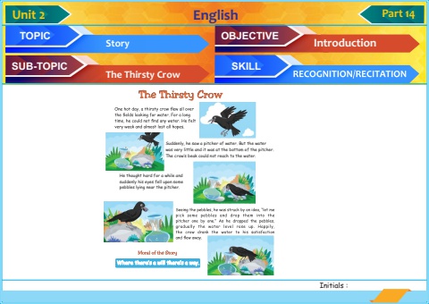 Initials : 11TOPIC SUB-TOPIC OBJECTIVESKILLStory English Part 14The Thirsty Crow IntroductionUnit 2Suddenly, he saw a pitcher of water. But the water was very little and it was at the bottom of the pitcher.The crow%u2019s beak could not reach to the water. He thought hard for a while and suddenly his eyes fell upon some pebbles lying near the pitcher.Where there%u2019s a will there%u2019s a way.